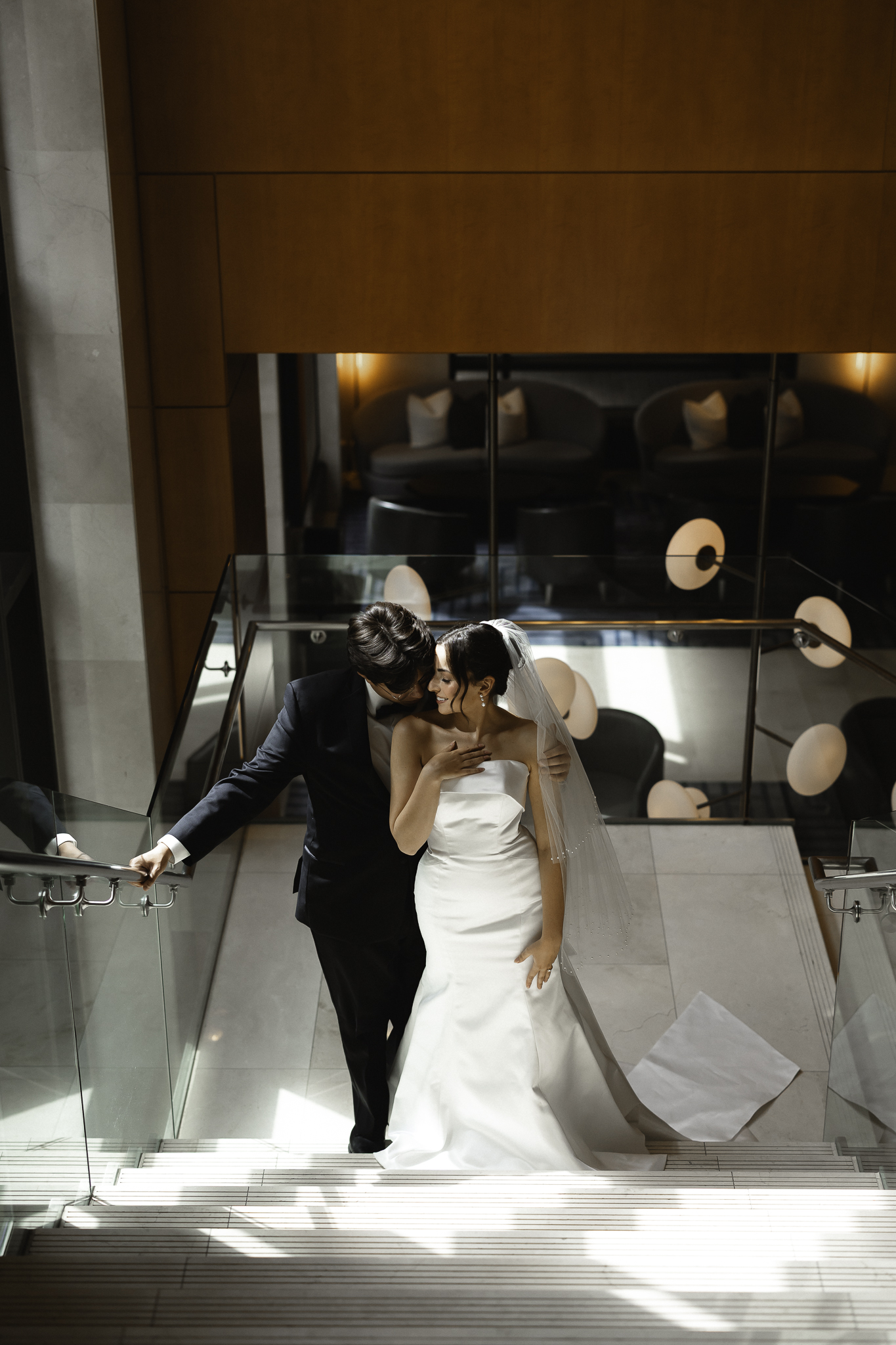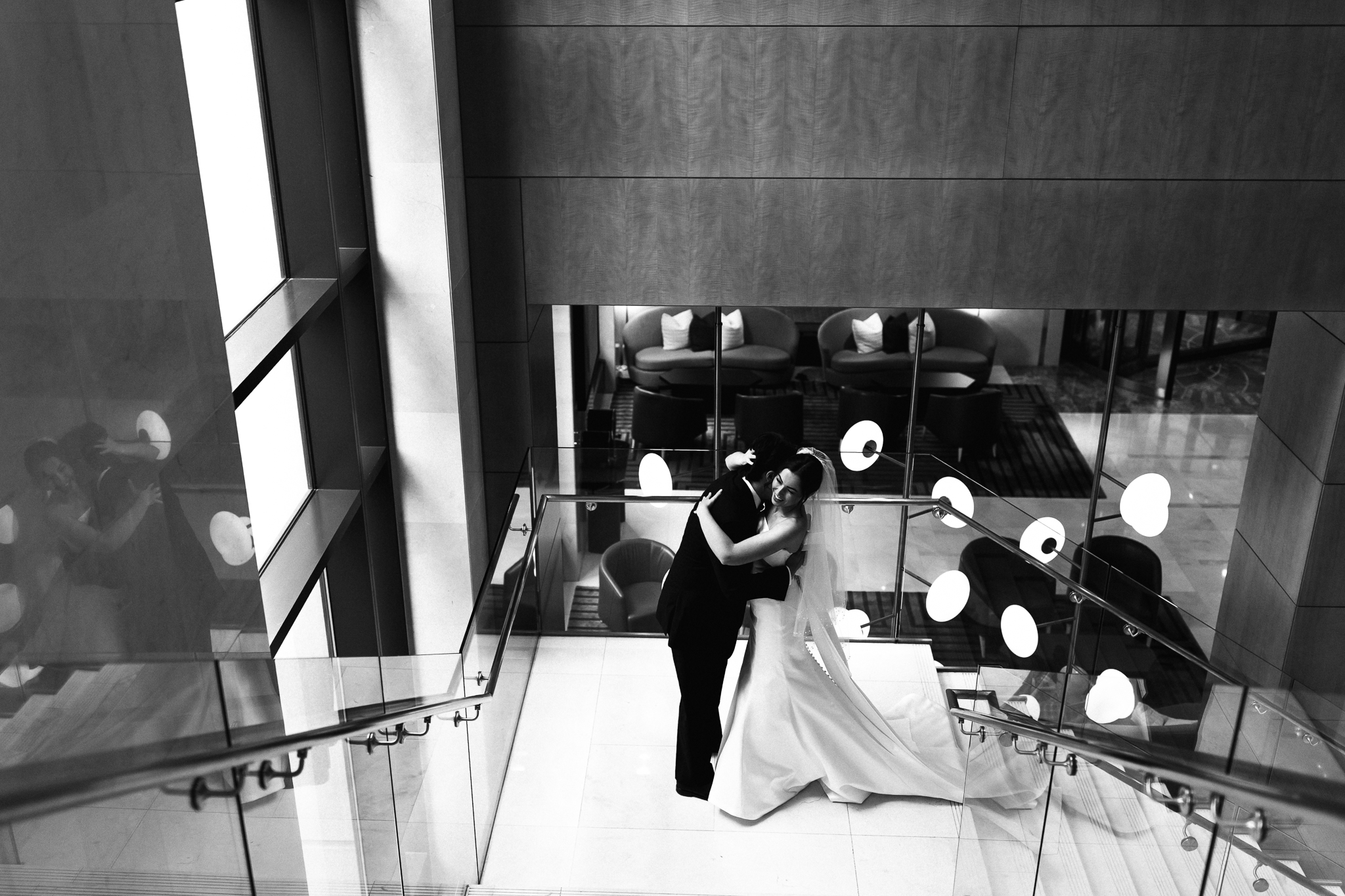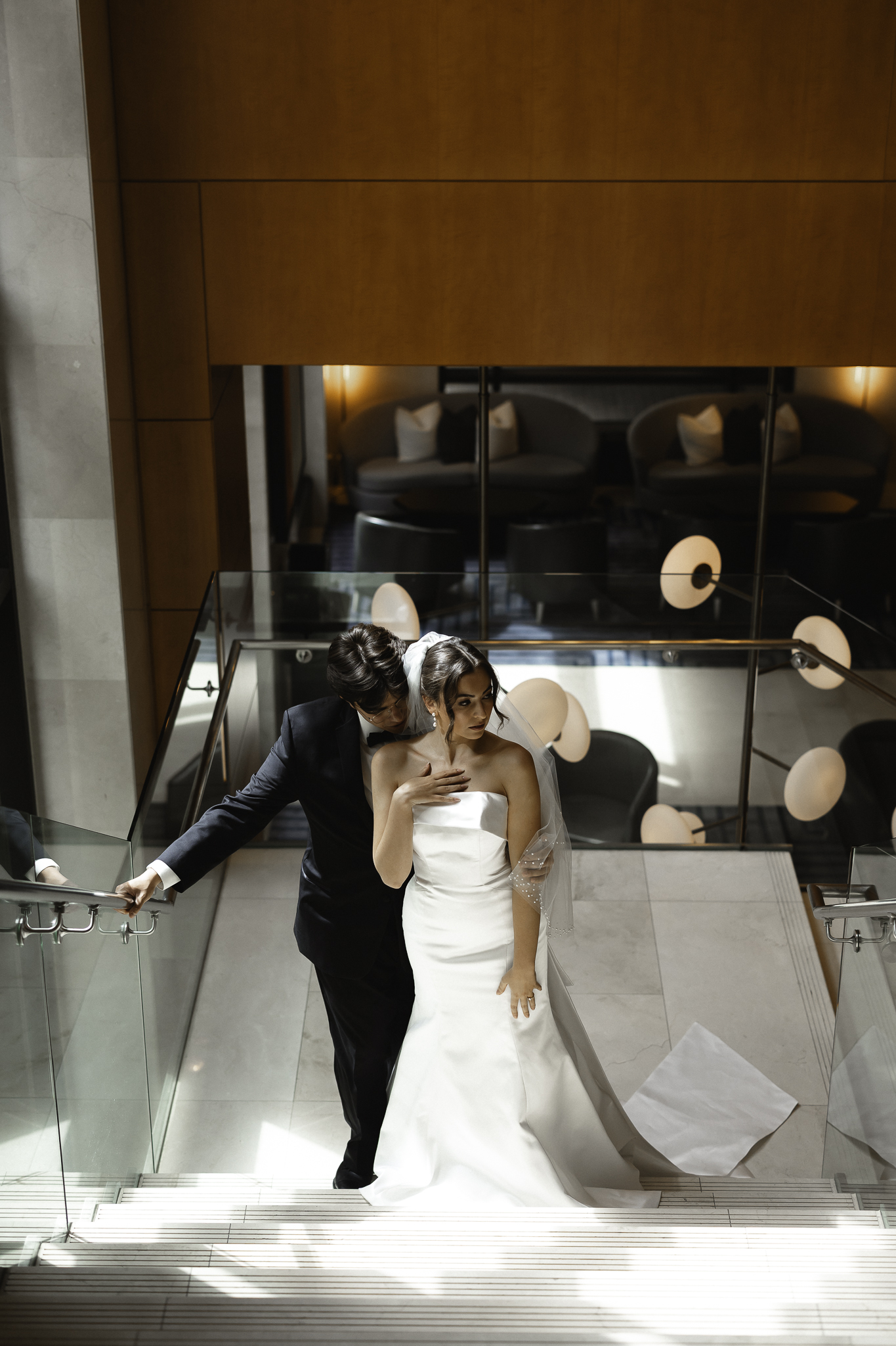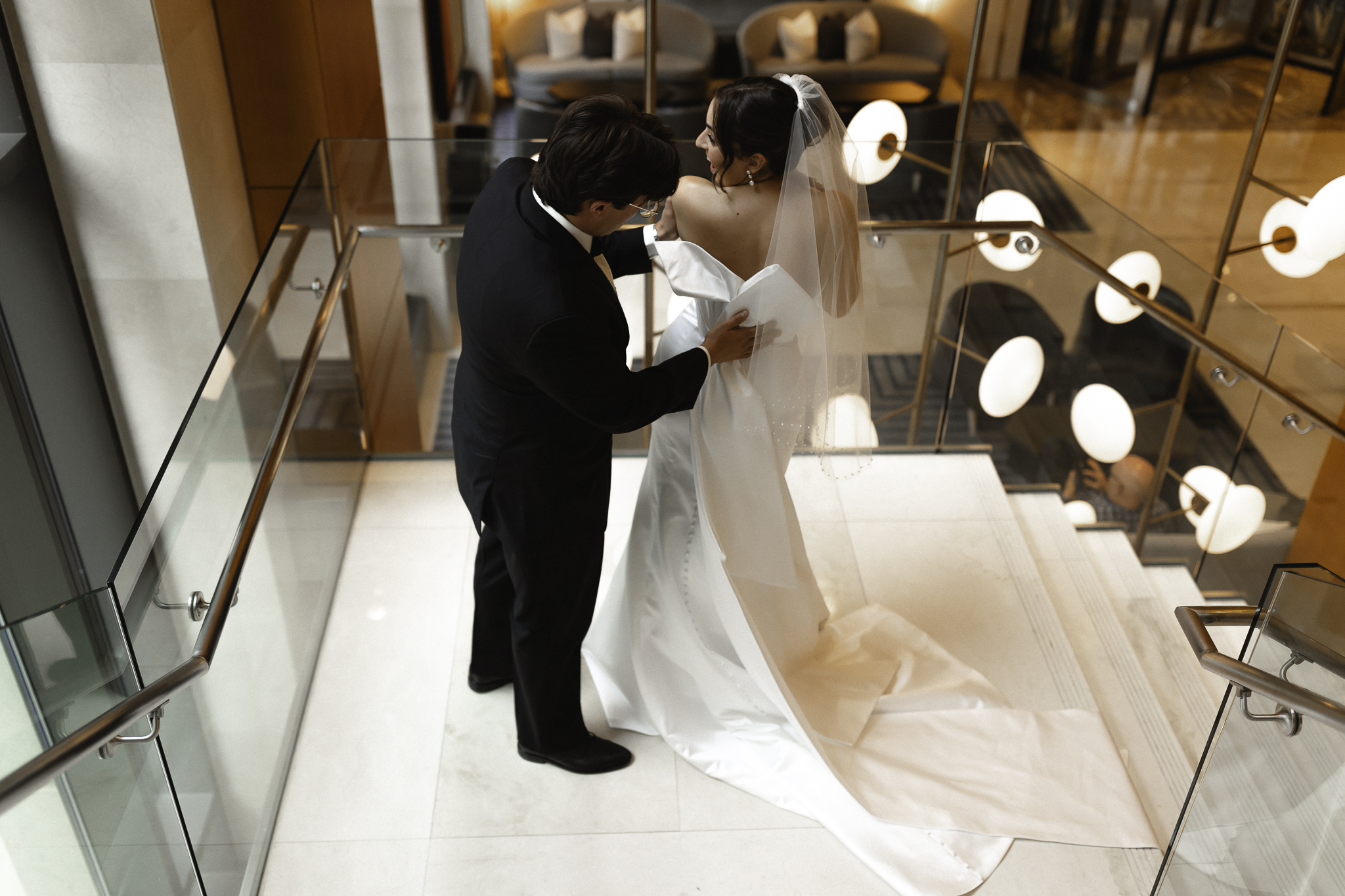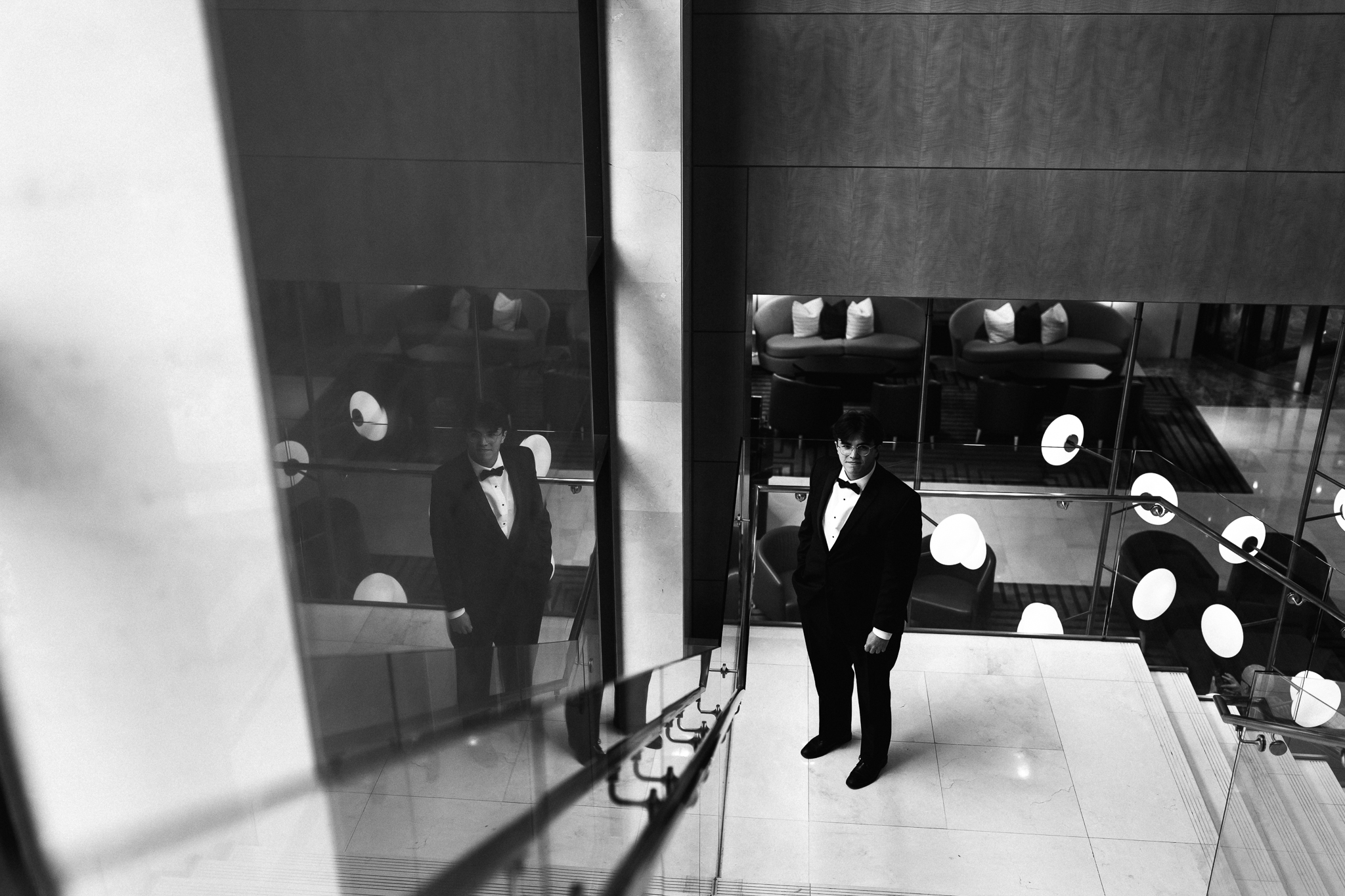 Camille and Kaden had a really beautiful first look on the stairs of the Four Seasons. I had previously photographed their engagement session at Union Station where we got this really stunning shot of them coming up the escalator with glass on both sides creating a fun two way reflection shot and I got to mimic that same look on these glass walls stairs. Absolutely love it when I get to play with reflections and composition within storytelling.