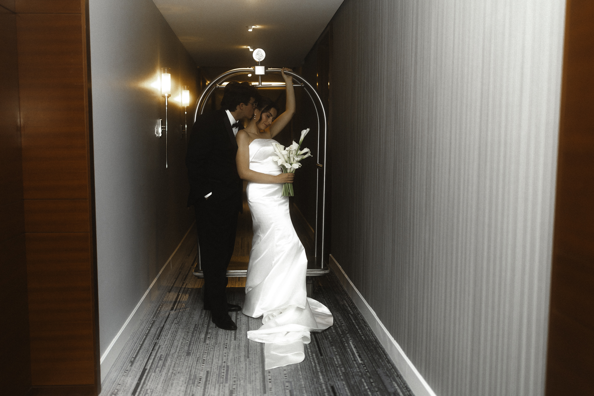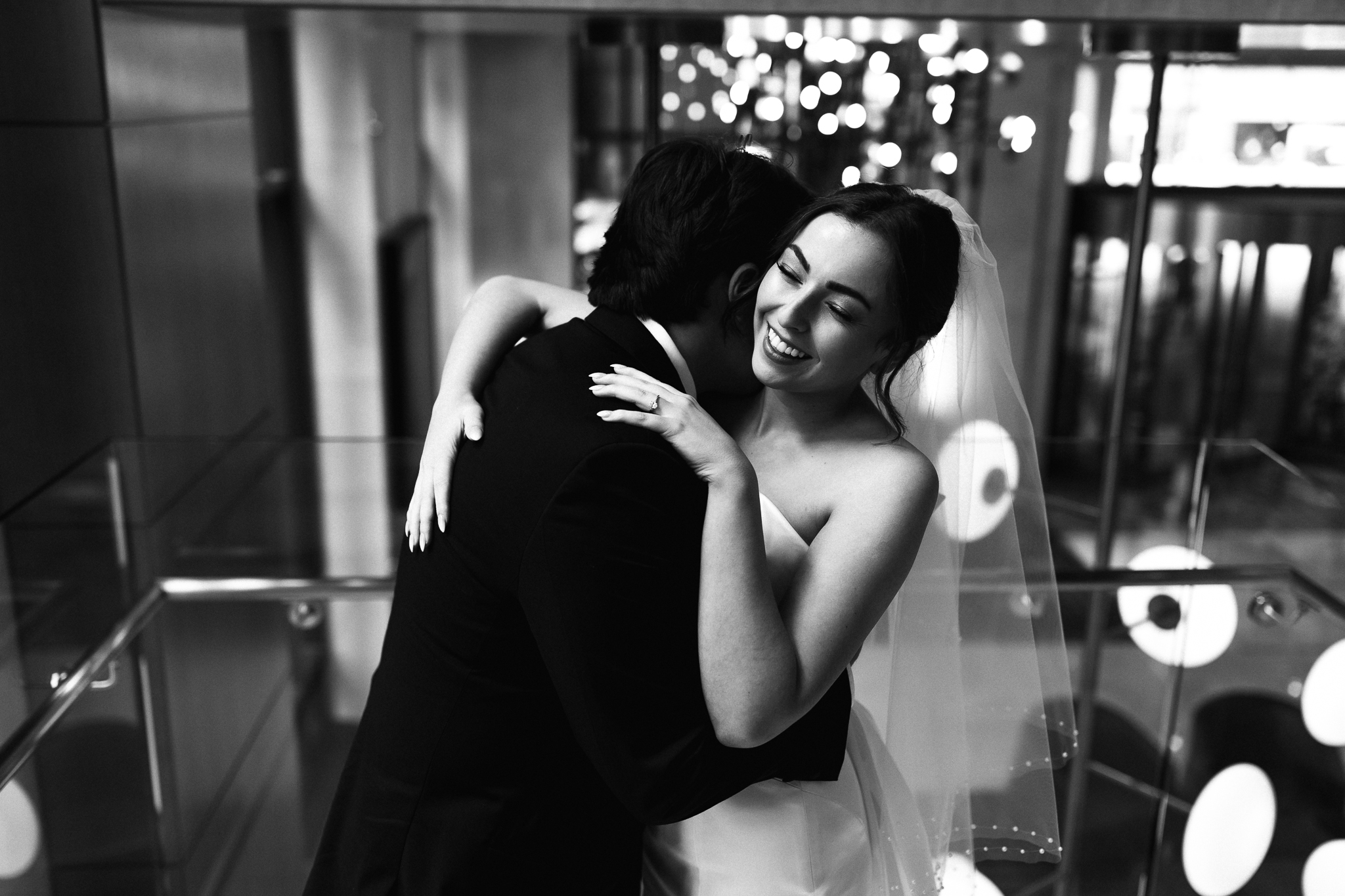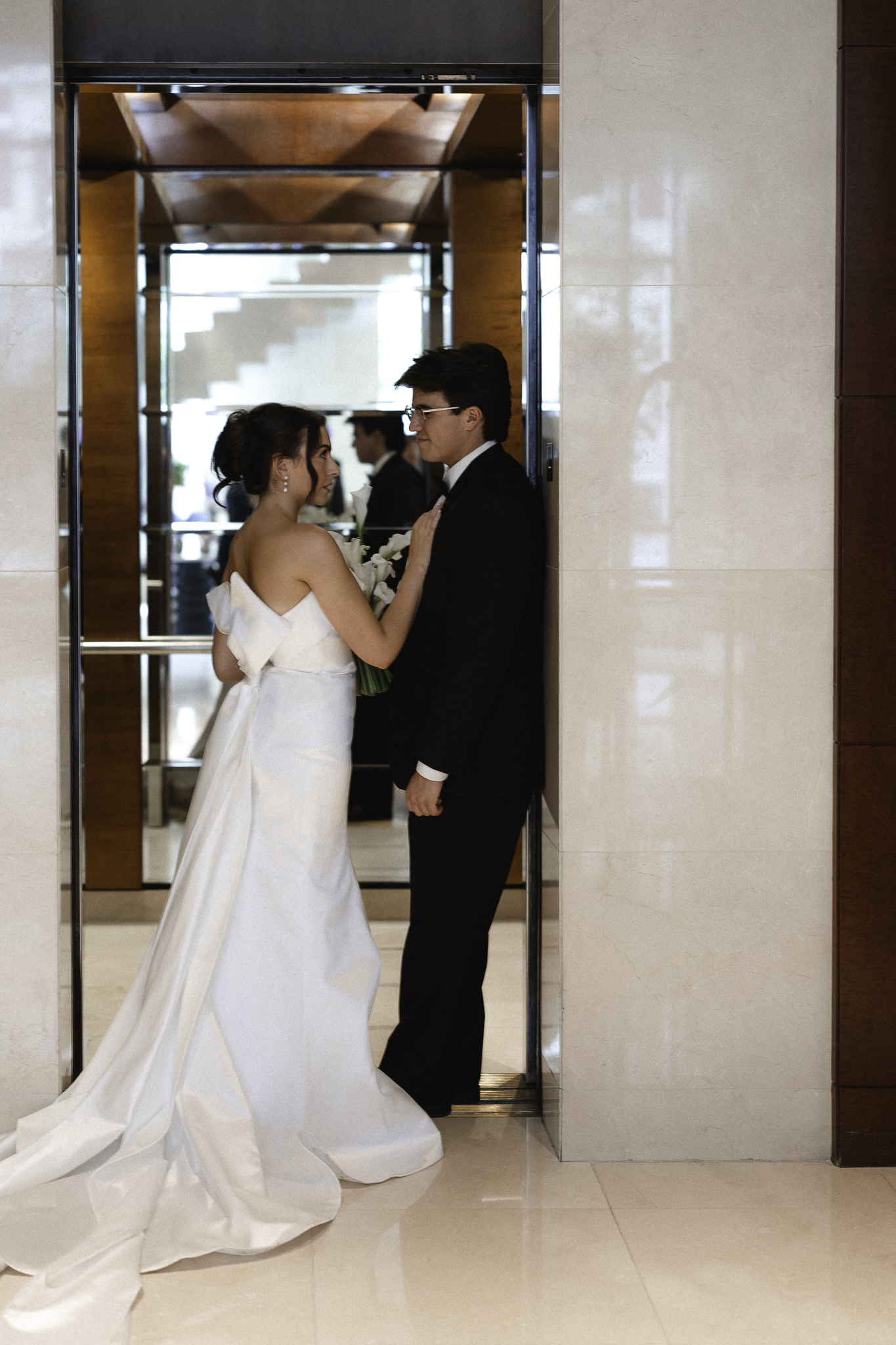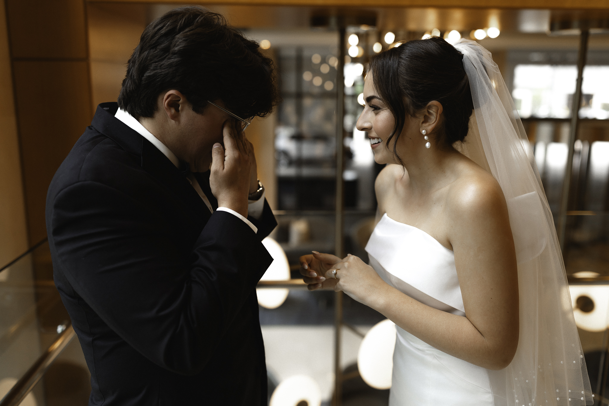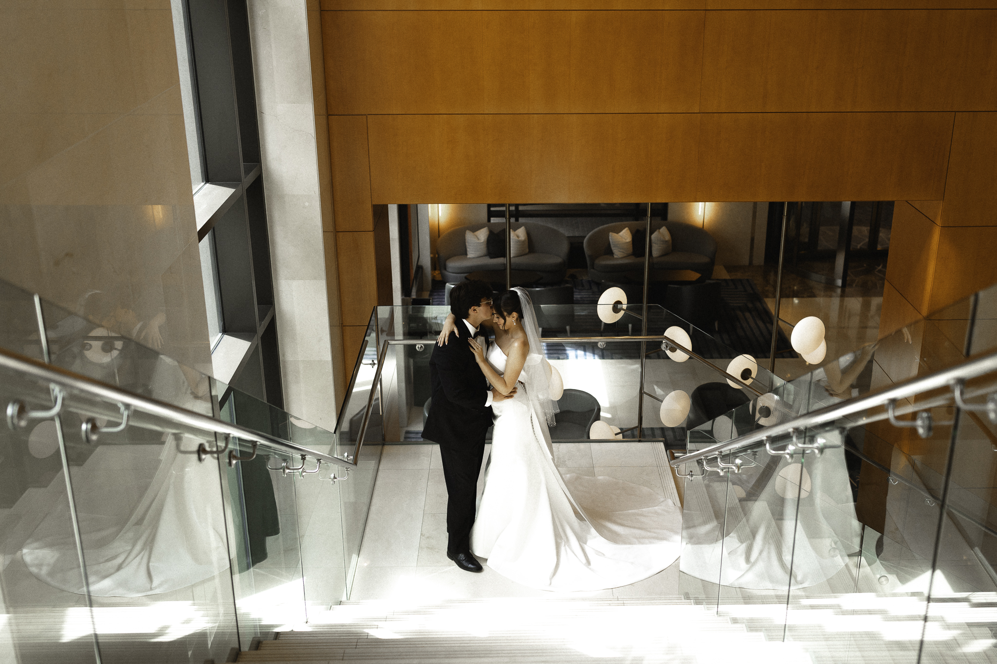Camille and Kaden had a really beautiful first look on the stairs of the Four Seasons. I had previously photographed their engagement session at Union Station where we got this really stunning shot of them coming up the escalator with glass on both sides creating a fun two way reflection shot and I got to mimic that same look on these glass walls stairs. Absolutely love it when I get to play with reflections and composition within storytelling.